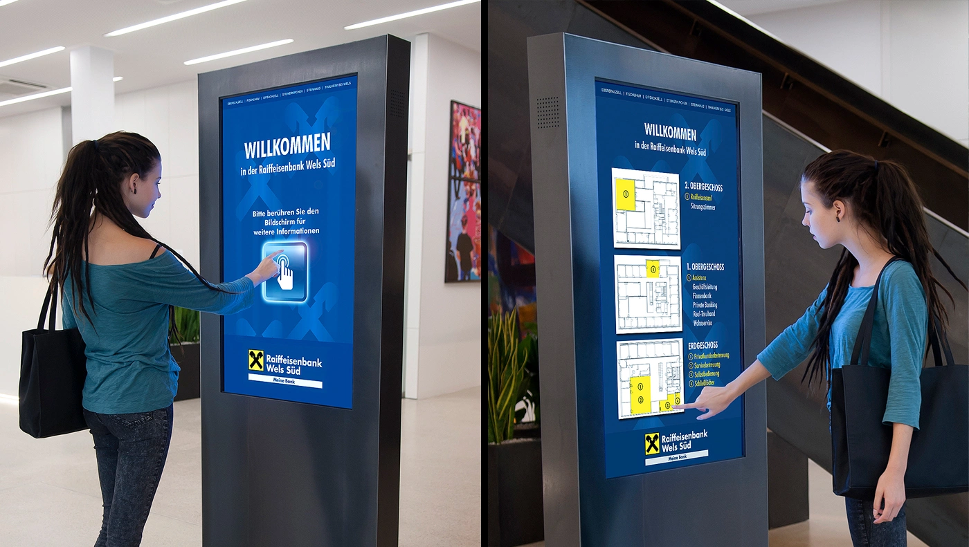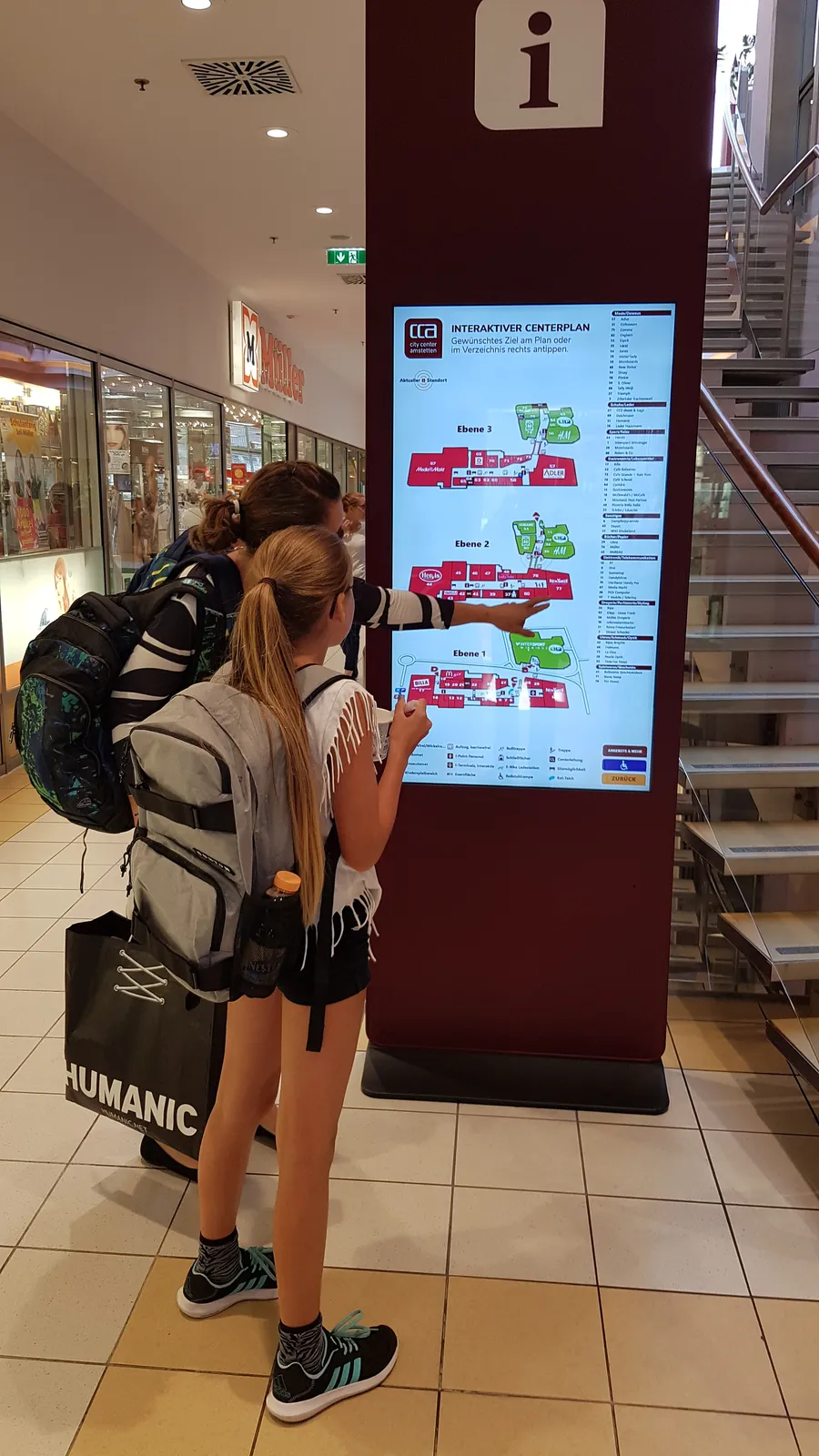 Die Displays im City Center Amstetten dienen als moderne Werbefläche und als übersichtliches Leitsystem. Per Klick erhalten Besucher eine klar strukturierte Centerkarte mit Suchfunktion zur schnellen Navigation zum gewünschten Geschäft.