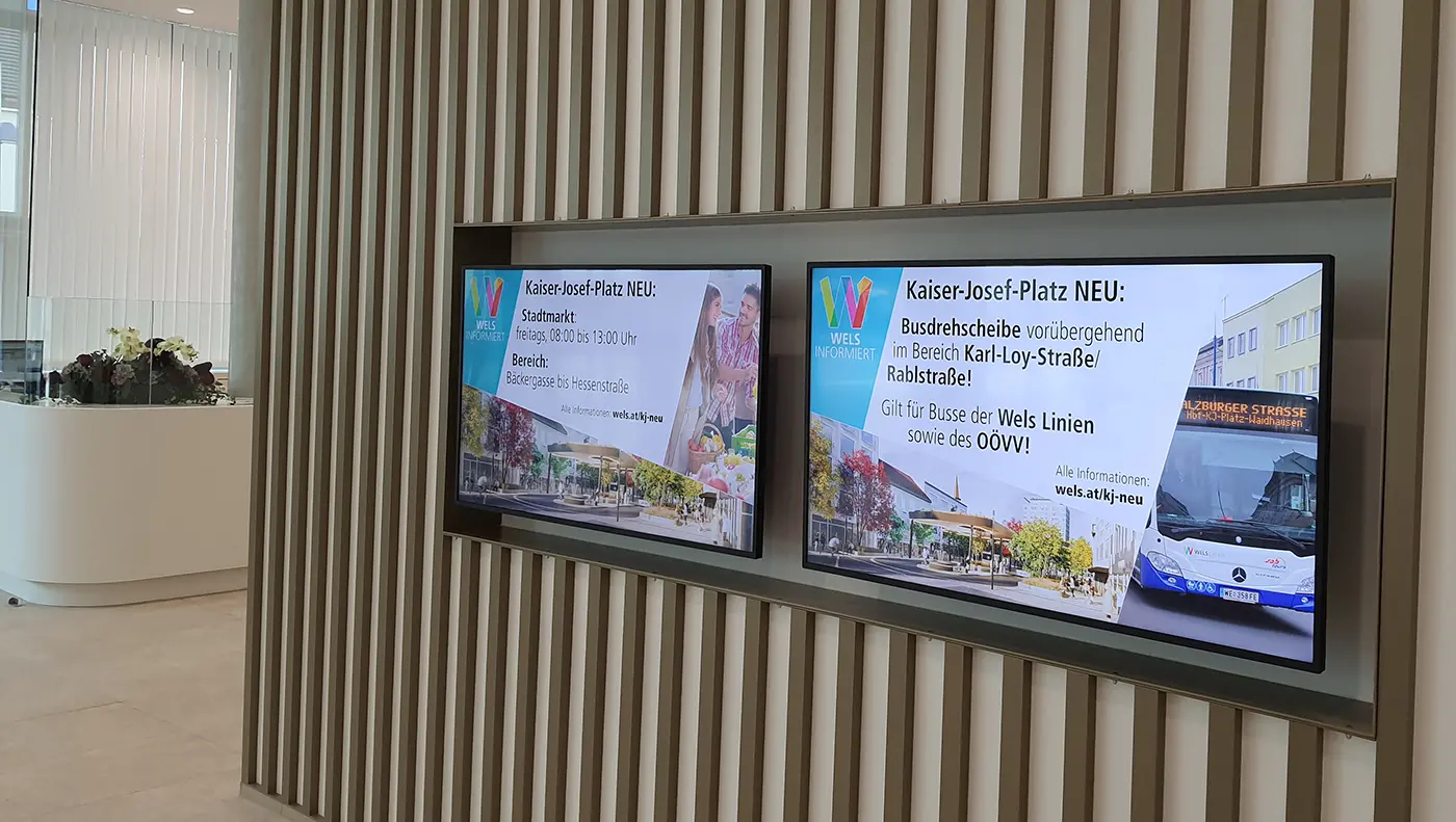 Die Infodisplays der Stadt Wels zeigen lokale Informationen und Veranstaltungshinweise im täglichen Betrieb. Bei Bedarf können sie auch für besondere Situationen genutzt werden: Hinweise bei Veranstaltungen, organisatorische Informationen oder behördliche Mitteilungen.