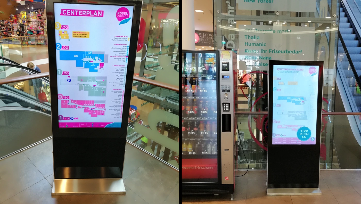 In der Rosen Arcade ermöglichen interaktive Displays eine intuitive Orientierung im gesamten Center. Die digitalen Stelen zeigen eine übersichtliche Centerkarte, unterstützen bei der Shopsuche und bieten Informationen zu aktuellen Angeboten und Services.