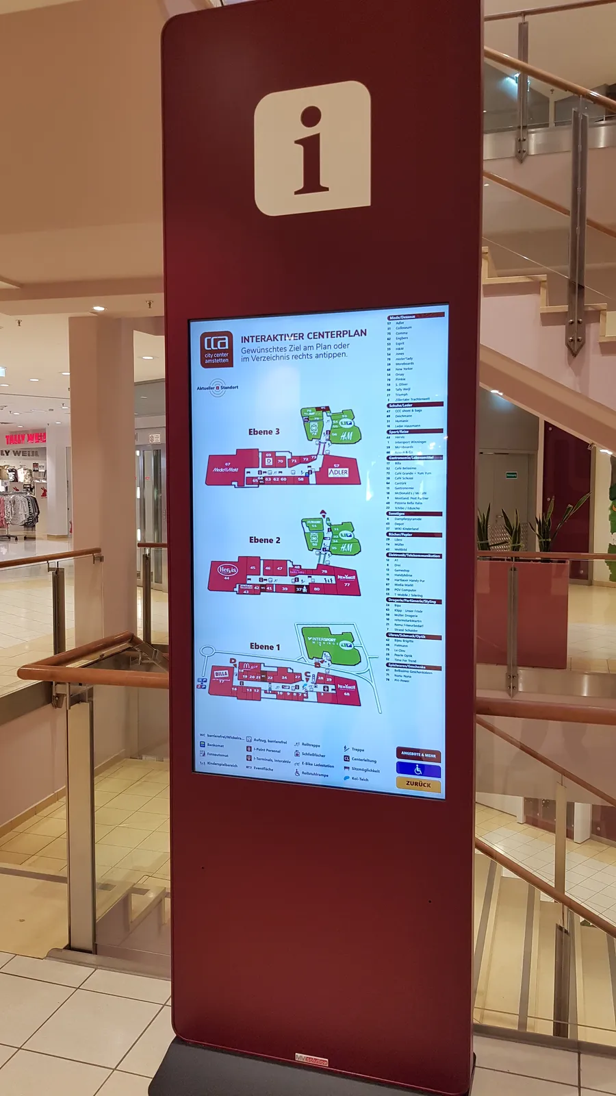 Die Displays im City Center Amstetten dienen als moderne Werbefläche und als übersichtliches Leitsystem. Per Klick erhalten Besucher eine klar strukturierte Centerkarte mit Suchfunktion zur schnellen Navigation zum gewünschten Geschäft.