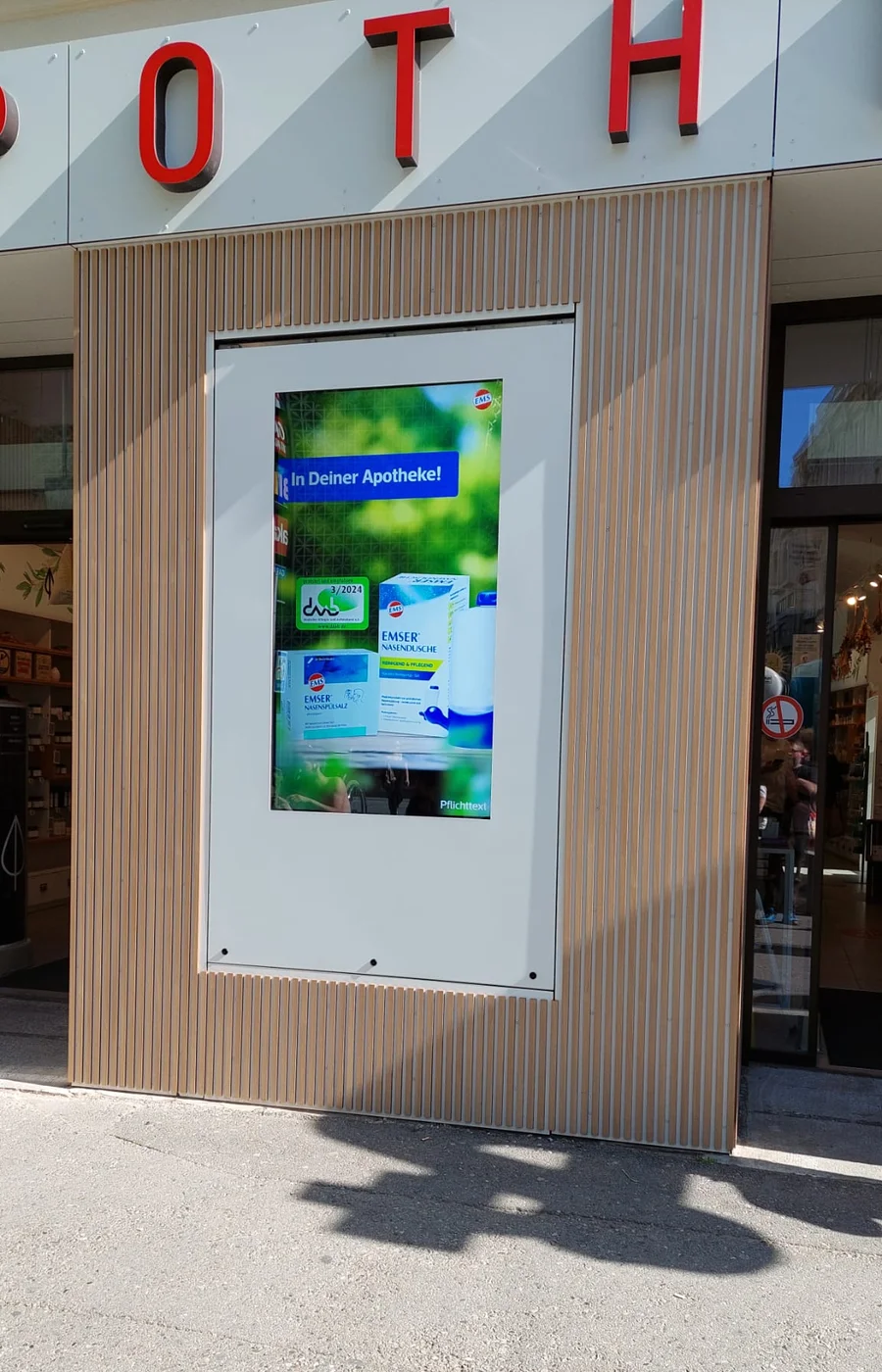 Für die Essenz Apotheken wurde ein flexibles Digital-Signage-System über mehrere Standorte realisiert. Ein grossformatiges Outdoor-Display sorgt für maximale Sichtbarkeit im öffentlichen Raum, Indoor-Displays informieren Kunden über Angebote und saisonale Empfehlungen.